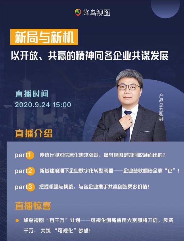 带着以上这些问题,蜂鸟视图产品总监张群将于9月24日(本周四 15:00)做客直播间,与众业内人士展开对话,带领大家一起了解信息化的机遇与挑战,探讨新基建浪潮下企业数字化转型的利器,快速帮助企业实现数字化转型,开创合作共赢新局面!