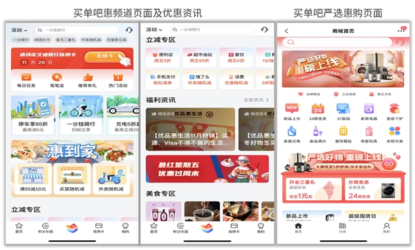“买单吧”APP6.0重点推出“惠”频道,涵盖美食、生活缴费、娱乐影音等领域内容,并将每日活动、惠出行、商户优惠等全平台优惠内容整合,支持客户基于实时行为状态及地址位置实现优惠信息的智能匹配和精准推荐,并且“惠”频道立体呈现置顶的“去绑卡-请绑定交行信用卡”功能,引导客户绑卡,助力客户转化和增长。另外,为积极响应国家乡村振兴战略和助农倡议,“买单吧”APP6.0推出了“乡村振兴”板块,上架了交行定点帮扶地区涉农品近百款,减少中间环节的流转和成本,优惠直达客户,助农又惠民;为满足客户分期购物需求,“买单吧”APP6.0上线了“严选惠购”场景业务,覆盖3C数码、家用电器、家居百货、美妆个护、母婴玩具等多种商品,提供最高24期免息分期、秒杀、立减优惠等优惠活动,为客户带来品质高、价格优、分期优惠的购物新体验。“买单吧”APP6.0快捷选择及丰富的优惠权益,强化“方便实惠”的品牌效应,带动客户消费和服务应用。
